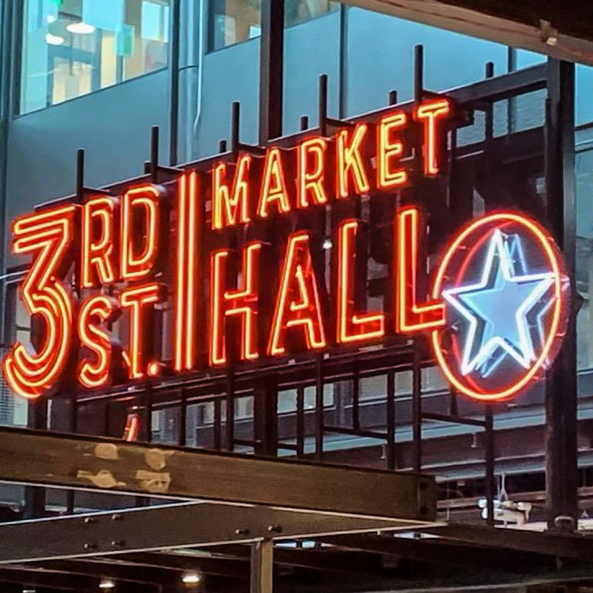3rd St Market Hall: Roof top open face channel letters mounted to steel frame with exposed LED NEON