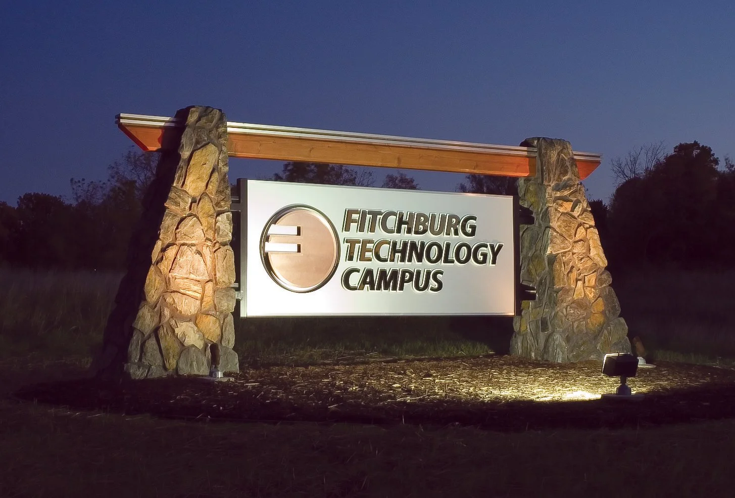 Monument Sign, Dimensional, Masonry, Residential, Edge Lighting, Wood